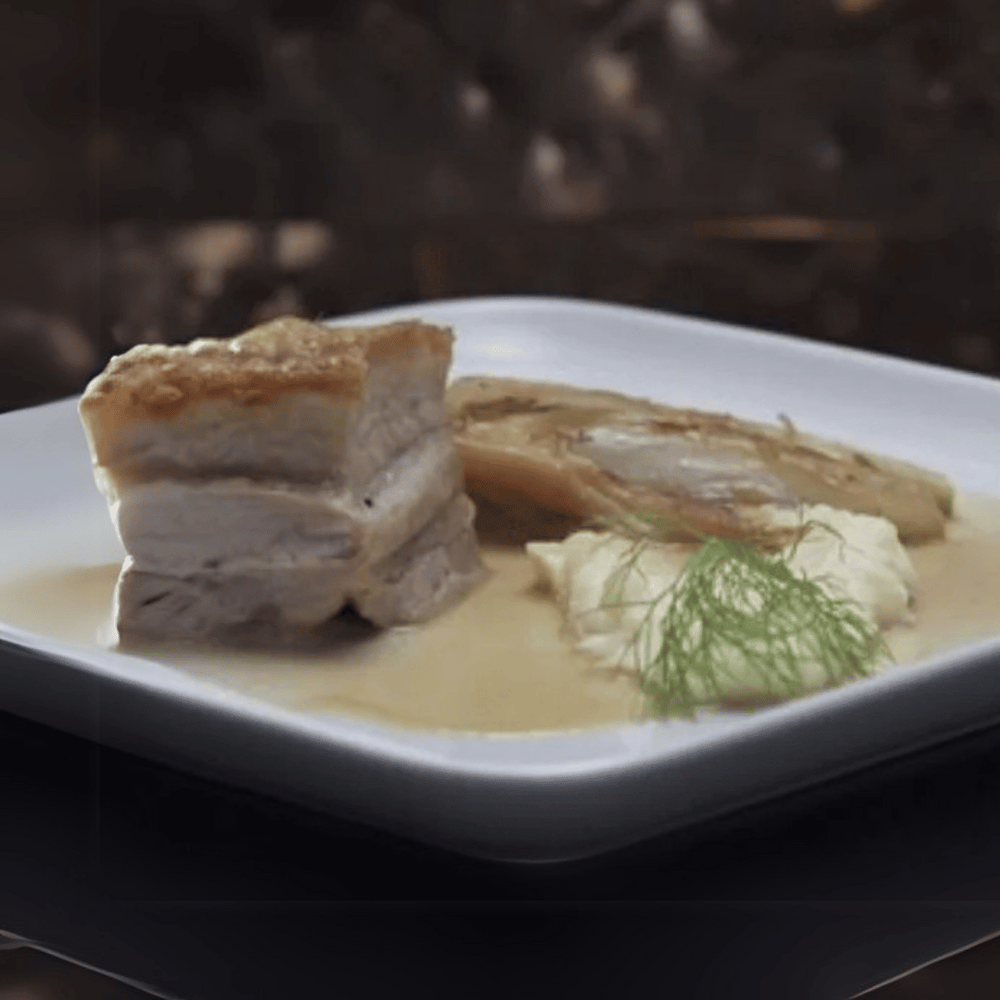 - Serve sliced pork with mashed potato, fennel and sauce. Garnish with fennel fronds.
