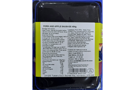 Pork (70%), Water, Rusk (WHEAT Flour – contains calcium carbonate, iron, niacin, thiamine), Salt, Apple 5% (SULPHITES), Seasoning (Salt, WHEAT Flour – contains Calcium Carbonate, Iron, Niacin, Thiamine, Sugar, Stabiliser Diphosphate, Yeast Extract [SULPHITE], Preservative Sodium SULPHITE, Flavourings, Spice Extracts, Antioxidants Sodium Ascorbate, Dextrose, Herb Extracts, Dried Onion)