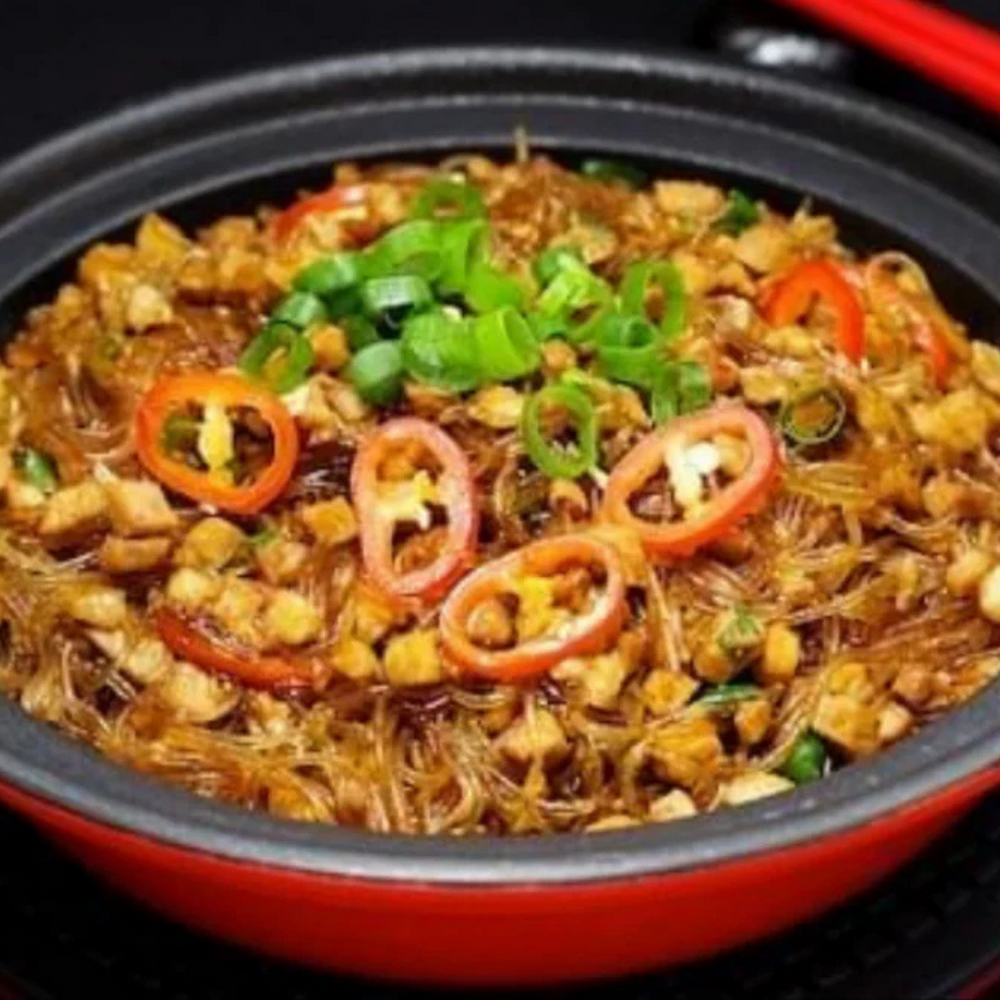將干米粉放入冷水中浸泡10分鐘。沖洗後瀝乾,備用。
