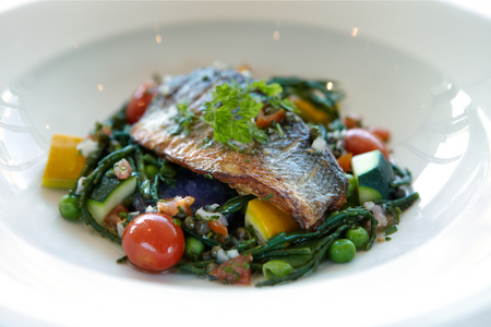 - 蒜香羅勒海鱸魚配番茄黃油醬 - 金黃的海鱸魚柳煎製後,淋上濃郁的番茄黃油醬,鮮美、充滿層次感且輕盈